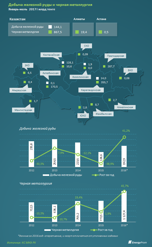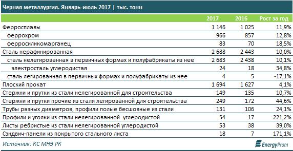 Перерабатывающий сектор также показывает рост: объемы производства черной металлургии выросли в стоимостном выражении на 46,6% за год, до 867,5 млрд тг за январь-июль 2017.