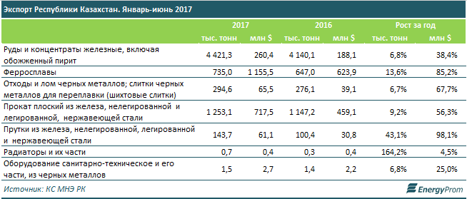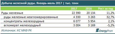 За первое полугодие 2017 из РК было экспортировано 4,42 млн тонн железных руд (+6,8% за год) на 260,4 млн долл США (+38,4% за год).