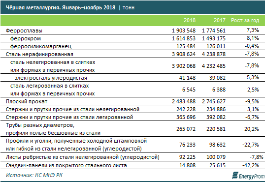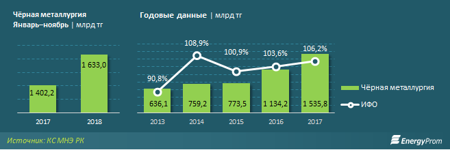 Объёмы чёрной металлургии за 11 месяцев текущего года выросли в деньгах на 16,5%, до 1,6 трлн тг. Производство сконцентрировано в Карагандинской (42,6%), Павлодарской (29,1%) и Актюбинской (19,4%) областях.