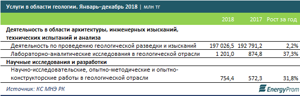 За прошлый год* объём услуг в сегменте геологической разведки увеличился на 2,2% за год и составил 197 млрд тг. Услуги в области лабораторно-аналитических исследований в геологической отрасли увеличились сразу на 37,3% за год, до 1,2 млрд тг. Объём услуг по научно-исследовательским работам в геологической отрасли достиг 754,4 млн тг, увеличившись за год сразу на 31,8%.