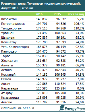 По итогам августа розничная стоимость жидкокристаллических телевизоров составляла в среднем по РК 149,8 тыс. тг, это на 55,2%* дороже, чем в аналогичном периоде 2015 года.
