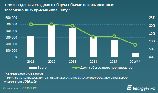 Снижение производства наблюдается с 2013 года, как и его доля в обеспечении спроса. Например, за январь-август 2016 года было произведено всего 60 тысяч телевизионных приемников, что составляет менее трети от прошлогодних показателей за аналогичный период.