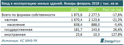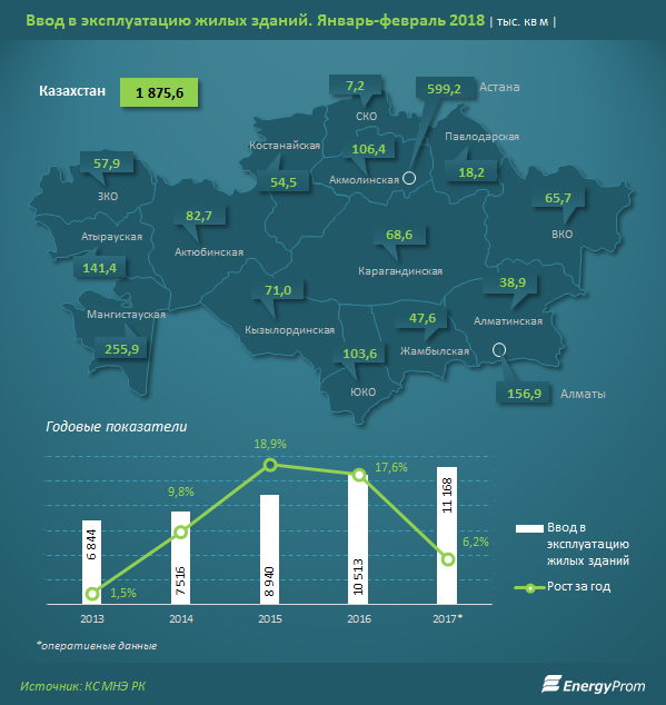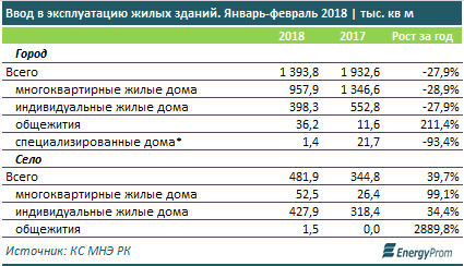 В региональном разрезе наибольшее сокращение темпов жилстроя отмечено в Алматы — сразу на 75,5% год-к-году, до 156,9 тыс. кв м за январь-февраль 2018, против 639,9 годом ранее. Также значительный минус зафиксирован в СКО (на 47,1% за год) и ЮКО (на 25,4% за год).