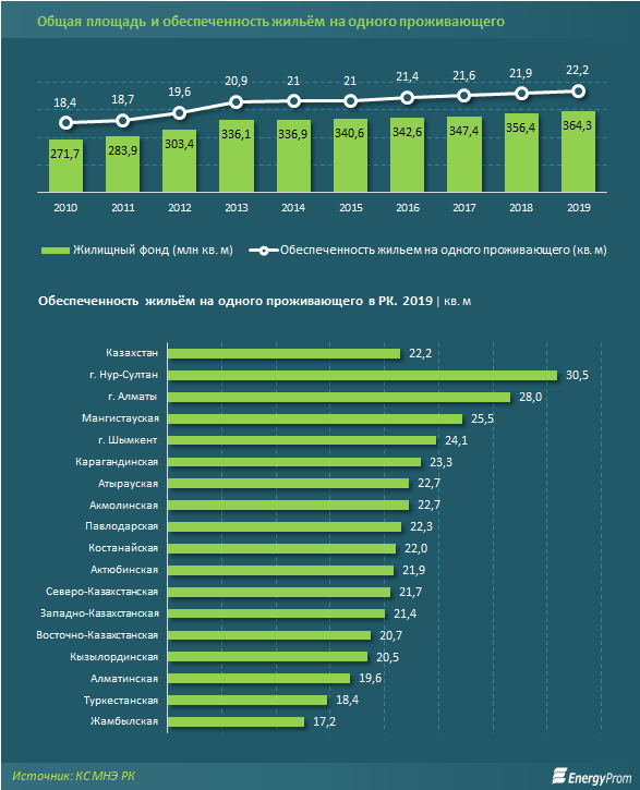 На конец 2019 года жилищный фонд в РК составил 364,3 млн кв. м — на 2,2% больше показателя предыдущего года (356,4 млн кв. м). За последние пять лет жилищный фонд в стране растёт в среднем на 1,6% за год. На одного проживающего в Казахстане приходится 22,2 кв. м. Обеспеченность жильём выросла за год на 1,4%. При этом уровень жилищной обеспеченности по стандартам ООН составляет 30 кв. м на человека.