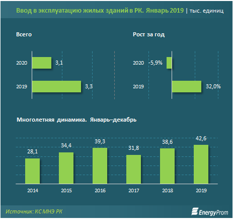 В январе 2020 года в Казахстане введено в эксплуатацию 3,1 тыс. жилых зданий — на 5,9% меньше, чем в аналогичном периоде прошлого года (3,3 тыс. жилых зданий).