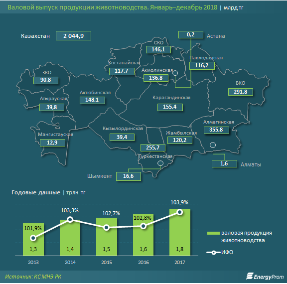 По итогам прошлого года валовой выпуск продукции животноводства увеличился почти на 13,2% год-к-году, до 2 трлн тг. С учётом инфляции ИФО составил 103,9%. Самые высокие показатели зафиксированы в Алматинской (355,8 млрд тг, +17,8% за год, ИФО — 3,7%), Восточно-Казахстанской (291,8 млрд тг, +11%, ИФО — 104,1%) и Туркестанской (255,7 млрд тг, ИФО — 104%) областях.