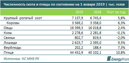 Заметим, согласно статистическим данным, количество сельскохозяйственных животных и птиц год-к-году ощутимо увеличилось. Так, на 9,5% выросло за год число лошадей — до 2,6 млн голов к 1 января текущего года; численность верблюдов составила 202,2 тыс. голов — плюс 7,3% за год. На 5,8% увеличилось поголовье КРС — до 7,1 миллиона. Поголовье домашней птицы выросло сразу на 10,8%, до 44,5 миллиона.