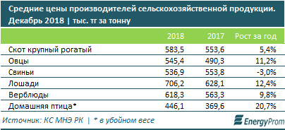 По итогам декабря 2018-го цены производителей на КРС выросли на 5,4% год-к-году, до 583,5 тысячи тенге за тонну, овец — на 11,2%, до 545,4 тысячи тенге за тонну, лошадей — на 12,4%, до 706,2 тысячи тенге за тонну, верблюдов — на 9,8%, до 618,3 тысячи тенге за тонну.