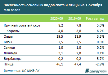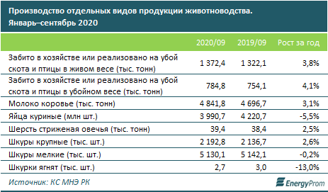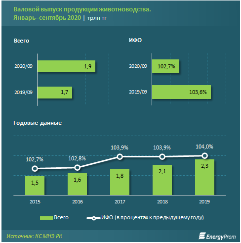 За январь–сентябрь 2020 года валовой выпуск продукции животноводства составил 1,9 трлн тг, увеличившись с учётом инфляции на 2,7% за год.