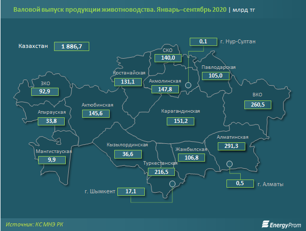В региональным разрезе наибольший объём выпуска продукции животноводства пришёлся на Алматинскую область: 291,3 млрд тг — на 2,9% больше в реальном выражении, чем годом ранее.