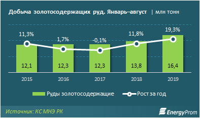 В Казахстане наблюдается рост золотодобычи. За восемь месяцев текущего года добыча золотосодержащих руд увеличилась на 19,3% за год и составила 16,4 млн тонн. В аналогичном периоде прошлого года было добыто 13,8 млн тонн золотосодержащих руд, рост составил 11,8%. Кроме того, за январь–август текущего года было добыто 218 тыс. тонн золотосодержащих концентратов.