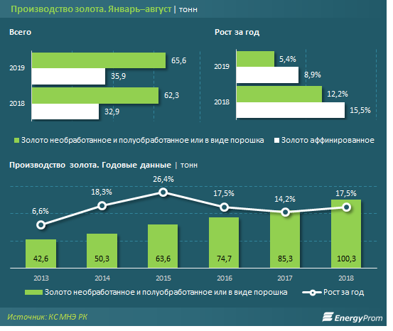 Соответственно, наблюдается и рост производства в секторе. За январь–август 2019 года выпуск необработанного и полуобработанного золота составил 65,6 тонны — на 5,4% больше по сравнению с аналогичным периодом прошлого года (62,3 тонны). Производство аффинированного золота увеличилось на 8,9% за год и составило 35,9 тонны. В аналогичном периоде годом ранее было произведено 32,9 тонны аффинированого золота.
