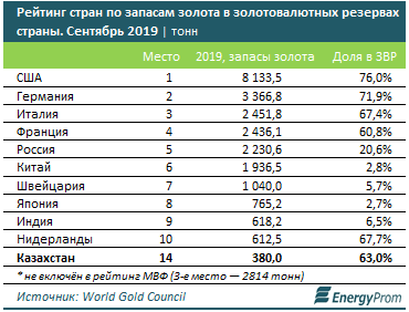 Казахстан занимает 14-е место по запасам золота в золотовалютных резервах страны. Доля золота в ЗВР достигла 63%.
