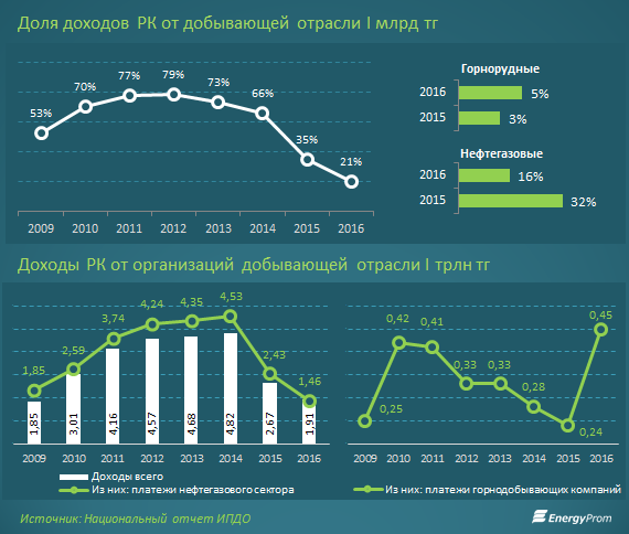 Доходы бюджета от нефтегазовой отрасли упали за 2016 год на 40% до очередного минимума, составив 1,46 трлн тенге, из которых 1,14 трлн тенге — доход Нацфонда (-30% к 2015). В том числе поступления НДПИ составили 279 млрд тенге (-40%), поступления КПН — 438 млрд (-23%), платежи за экспорт нефти — 119 млрд (-48%) и ЭТП 639 млрд (-1%).