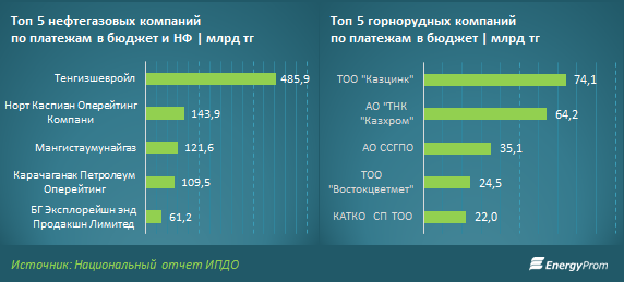По данным национального отчета ИПДО, всего пять компаний из 178 нефтегазовых предприятий РК формируют 63% нефтяного дохода страны. Лидирующую позицию занимает «Тенгизшевройл», чьи платежи в госбюджет и Нацфонд составили 486 млрд тенге или 33%. За 2016 год объем добычи нефти ТШО составил 27,56 млн тонн нефти — это 42% республиканского объема. Далее идут «Норт Каспиан Оперейтинг Компани Н.В.» — 144 млрд, «Мангистаумунайгаз» — 122 млрд, «Карачаганак Петролеум Оперейтинг Б.В.» — 109 млрд и «БГ Эксплорейшн энд Продакшн Лимитед» — 61 млрд тенге.
