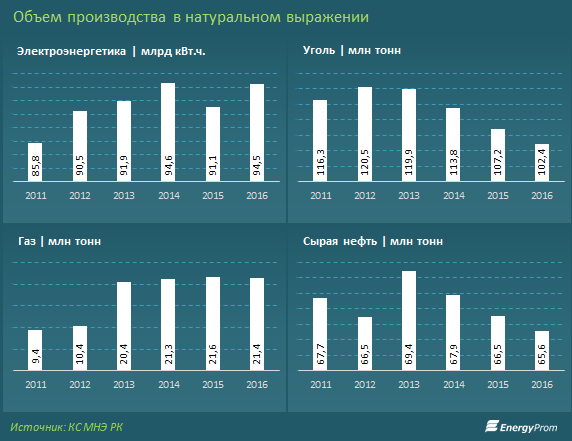 Добыча угля снизилась на 4%, до 102 млн тонн. Добыча газа остается стабильной, спад составил лишь 1%, с 22 до 21 млн тонн. Добыча сырой нефти сократилась также на 1%, с 67 до 66 млн тонн.