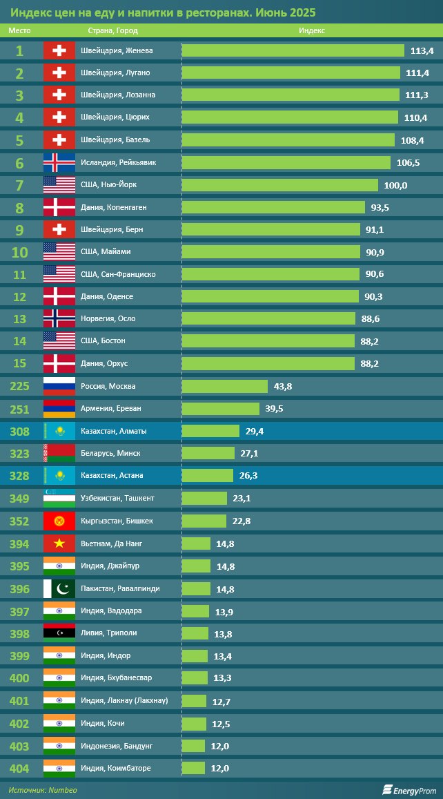 В июне текущего года сразу пять первых мест заняли города Швейцарии — Женева (113,4), Лугано (111,4), Лозанна (111,3), Цюрих (110,4) и Базель (108,4). Их жителям поход в ресторан обходится на 8,4%–13,4% дороже, чем ньюйоркцам. Среди швейцарских городов в десятку лидеров по дороговизне (на девятое место) также попал Берн: 91,1, то есть цены там ниже, чем в Нью-Йорке, на 8,9%. В числе городов, где цены в ресторанах выше, чем в нью-йоркских, оказался исландский Рейкьявик (106,5), а сам Нью-Йорк расположился на седьмом месте.