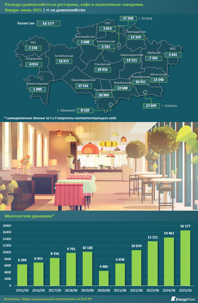 В среднем по Казахстану расходы домохозяйств на рестораны и кафе за январь–июнь 2025 года составили 16,6 тыс. тг. Для сравнения: в первом полугодии 2024-го расходы домохозяйства показатель составлял 14,5 тыс. тг, а в аналогичном периоде 2023 года — 13,3 тыс. тг.