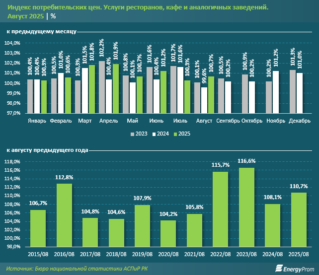 При этом за год цены на услуги ресторанов, кафе и аналогичных заведений выросли на 10,7%, против 8,1% в августе 2024-го.
