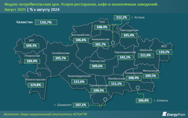 Наименее заметно услуги ресторанов и кафе подорожали в Акмолинской (на 1,7%) и Западно-Казахстанской (на 4,3%) областях. Для справки: в Астане цены выросли на 12,2%, в Алматы — на 6,8%.