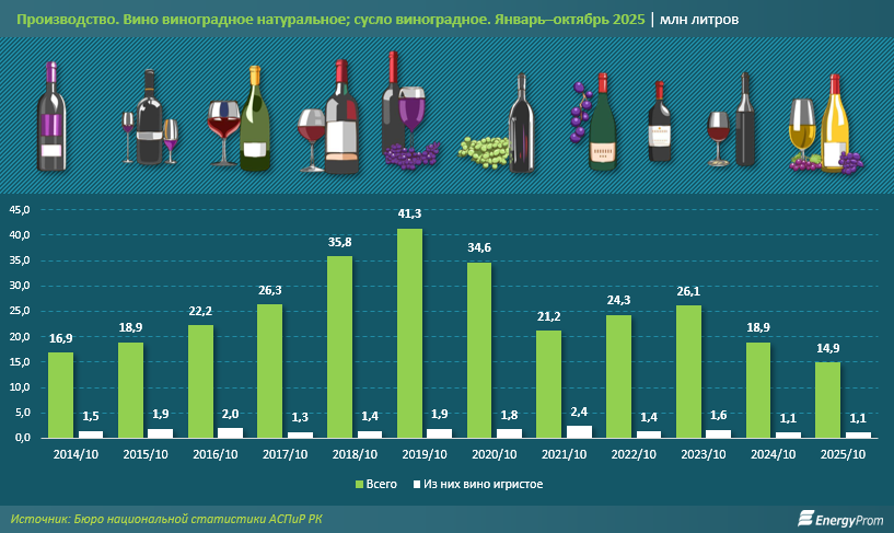 За январь–октябрь текущего года в РК произвели 14,9 млн литров натурального виноградного вина и сусла — на 21,1% меньше, чем за аналогичный период 2024-го. Годом ранее также было отмечено уменьшение выпуска на 27,8%.