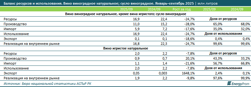 Отечественные виноделы обеспечили спрос (реализацию на внутреннем рынке плюс экспорт) на натуральное виноградное вино, кроме игристого, а также на сусло на 65% за январь–сентябрь 2025-го, против 68% годом ранее. Импорт за год сократился на 17,6%, составив 5,9 млн литров. Объём реализации на внутреннем рынке уменьшился сразу на 24,7%, до 16,8 млн литров.