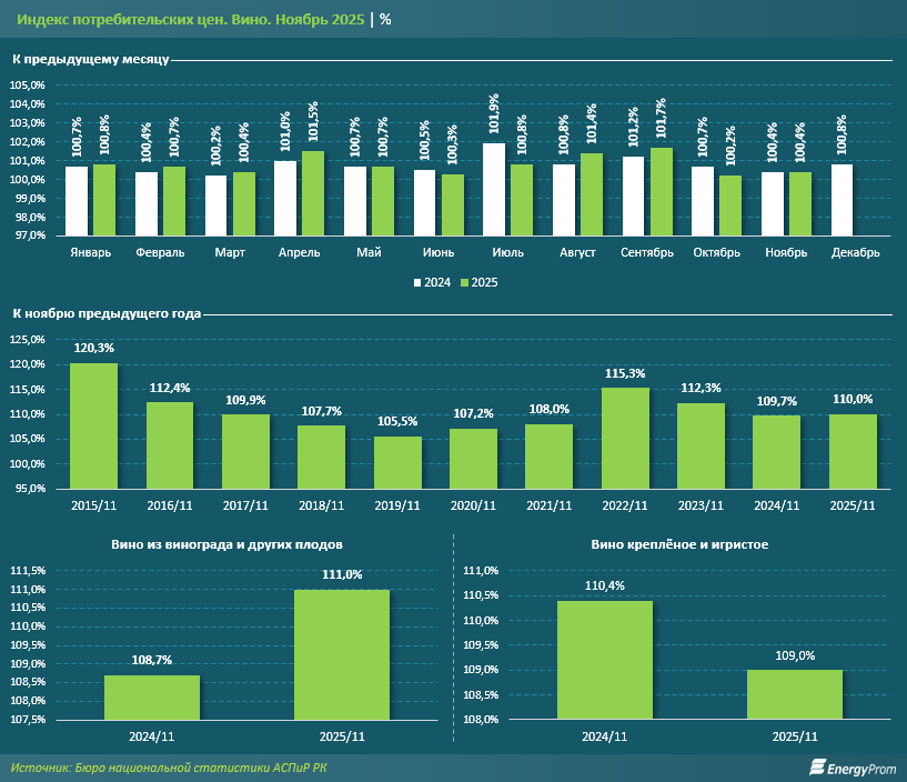 По итогам ноября текущего года вино в Казахстане подорожало на 0,4% за месяц. Для сравнения: месяцем ранее цены выросли на 0,2%, а в ноябре прошлого года — на 0,4%. Вино дорожает уже 49 месяцев подряд, а удешевления не наблюдалось с момента начала ведения статистики в 2011 году.