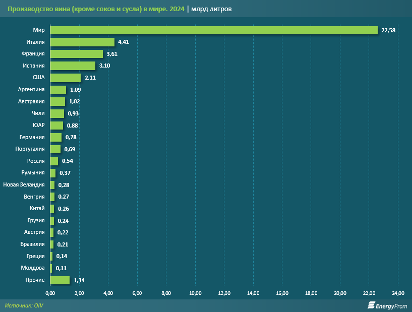 Согласно данным Международной организации винограда и вина (OIV), в 2024 году в мире было произведено 22,6 млрд литров вина (кроме соков и сусла). Почти 20% всего объёма выпуска пришлось лишь на Италию: 4,4 млрд литров. Следом идут Франция (3,6 млрд литров), Испания (3,1 млрд литров), США (2,1 млрд литров), Аргентина (1,1 млрд литров) и Австралия (1 млрд литров): на эти пять стран совокупно пришлась ещё почти половина глобального производства вина, а если суммировать с лидирующей Италией — почти 70%. Следует отметить соседние с РК Россию и Китай, где было выпущено 540 млн и 260 млн литров вина соответственно.