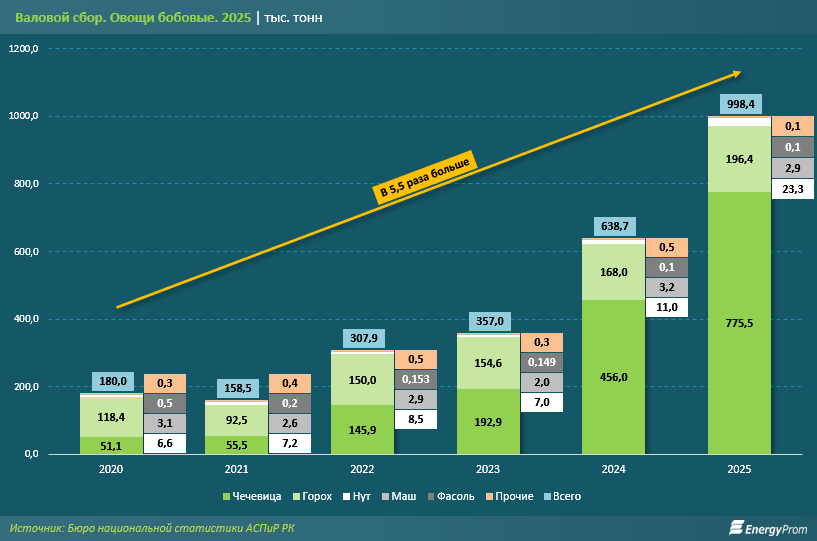 Казахстанские фермеры получили рекордный урожай бобовых. Согласно данным из отчётов Бюро национальной статистики (БНС) АСПиР РК, валовой сбор таких овощей в прошлом году превысил 998,4 тыс. тонн — в 1,5 раза больше, чем в 2024-м. Сравнение данных за пять лет демонстрирует ещё более впечатляющую динамику: общий сбор бобовых вырос в 5,5 раза. Такой стремительный подъём свидетельствует о высоком интересе к сегменту, внедрении новых технологий выращивания и расширении посевных площадей под бобовые культуры. Об этом — чуть ниже.