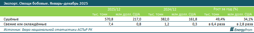Сушёных бобовых также стали продавать за границу намного больше. Объём экспорта за январь–декабрь 2025-го превысил 570 тыс. тонн — почти в полтора раза больше, чем годом ранее. Крупнейшим импортёром сушёных бобовых из РК стала Турция: 69,2% от общего объёма в натуральном выражении. Хорошо покупали такие сельхозкультуры и торговые партнёры из Афганистана, Китая и Узбекистана.