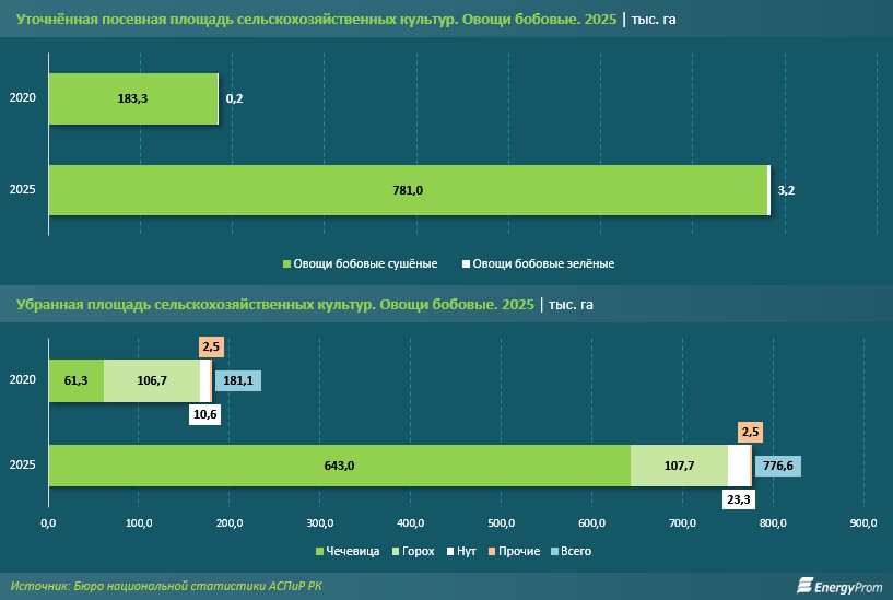 Традиционно агропроизводители в сегменте делали упор на сушёные бобовые: их проще хранить и транспортировать. Валовой сбор сушёных бобовых в 2025 году составил почти 1 млн тонн, увеличившись сразу на 56,3%. Наиболее значительный вклад внесли сельскохозяйственные предприятия, чья доля в общем объёме производства составила 76,7%. Менее крупные формирования — крестьянские и фермерские хозяйства — обеспечили более 23% выпуска сушёных бобовых.