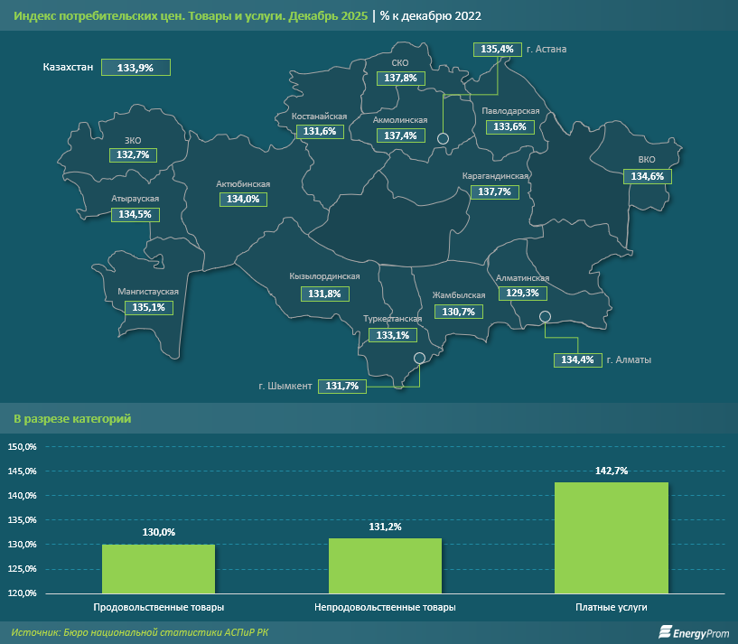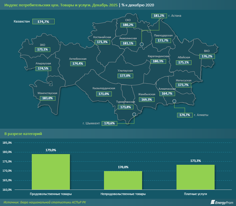 Региональный разрез показывает максимальное удорожание товаров и услуг в Мангистауской области (на 83%), Астане (на 81,2%), Акмолинской области (на 81,1%) и Карагандинской области (на 80,3%). Более умеренные темпы роста цен были отмечены в Алматинской (на 64,7%) и Жамбылской (на 69,3%) областях.