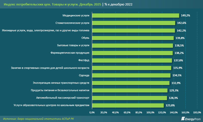 Если расширить горизонт сравнения до пяти лет (декабрь 2025-го к декабрю 2020-го), масштаб удорожания жизни становится ещё более наглядным. Средний рост цен для казахстанцев на товары и услуги за пять лет составил 74,7%. Стоит отметить, что на 2020 год пришёлся другой масштабный кризис, связанный с пандемией Covid-19, когда экономика сталкивалась с локдаунами, ограничениями на передвижение и сбоями в глобальных цепочках поставок.