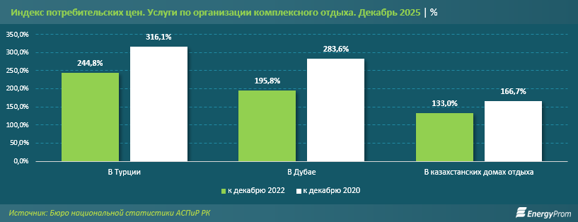 Отдельного внимания заслуживает отдых. По сравнению с декабрём 2020 года турпоездки в Турцию подорожали более чем в 3 раза, в Дубай — почти в 3 раза, услуги домов отдыха внутри страны — на 66,7%. За три года рост цен на зарубежный отдых оказался ниже, всё же значительно превысив общую инфляцию: в Турции — в 2,4 раза, в Дубае — в 2 раза, в домах отдыха внутри страны — на треть.