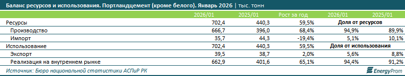 По итогам января текущего года отечественные компании обеспечили спрос (реализацию на внутреннем рынке плюс экспорт) на портландцемент на 94,9%, против 89,9% годом ранее. Производство увеличилось сразу на 68,4% за год, достигнув 666,7 тыс. тонн. В то же время импорт сократился на 19,4%, до 35,7 тыс. тонн.