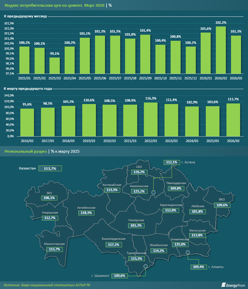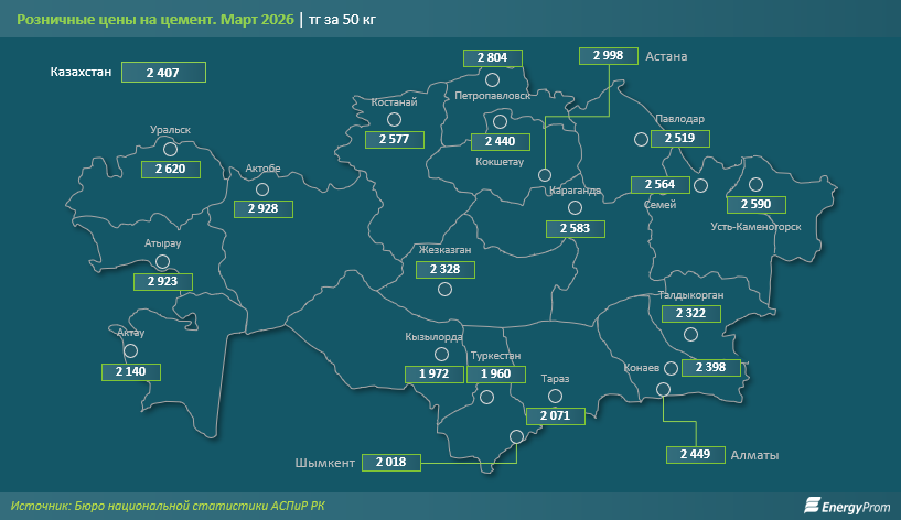 Средняя розничная цена на 50 кг цемента в марте 2026 года в Казахстане составила 2,4 тыс. тг. Среди крупных городов страны дороже всего цемент обходился жителям Астаны и Петропавловска (по 3 тыс. тг), а также Актобе и Атырау (по 2,9 тыс. тг). Самые низкие цены были зафиксированы в Туркестане, Кызылорде и Шымкенте: по 2 тыс. тг в каждом из городов. В Алматы, Талдыкоргане и Конаеве средняя цена составила по 2,4 тыс. тг за 50 кг.