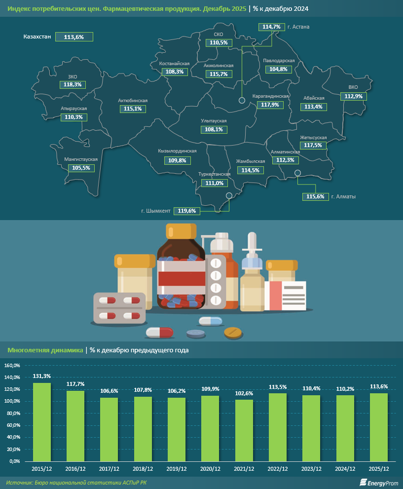 Фармацевтическая продукция в Казахстане дорожает уже 51 месяц подряд, а не снижаются цены в месячной динамике с момента начала ведения статистики, то есть уже 15 лет. По итогам декабря 2025 года фармацевтическая продукция подорожала на 0,9% за месяц и на 13,6% за год.