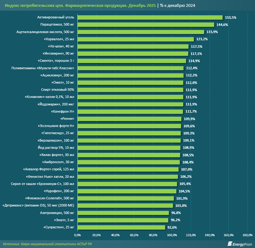 Наиболее заметное удорожание по итогам декабря прошлого года было зафиксировано по социально чувствительным и широко потребляемым препаратам. «Корвалол» вырос в цене более чем на 23,2%, ацетилсалициловая кислота — на 33,9%, парацетамол — на 44,6%, а активированный уголь — более чем в полтора раза. Эти позиции формируют наибольший инфляционный эффект для населения, поскольку используются массово и регулярно, а их удорожание напрямую отражается на потребительском восприятии цен в аптечном сегменте.