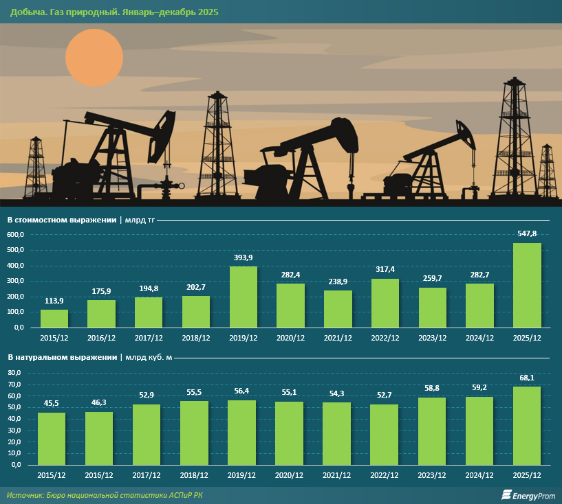 Согласно данным БНС, в Казахстане за январь–декабрь 2024 года было добыто 26 млрд куб. м природного газа в газообразном состоянии — на 7% больше, чем годом ранее. В 2025-м объём добычи вырос на 5,8%, до рекордных 27,5 млрд куб. м.