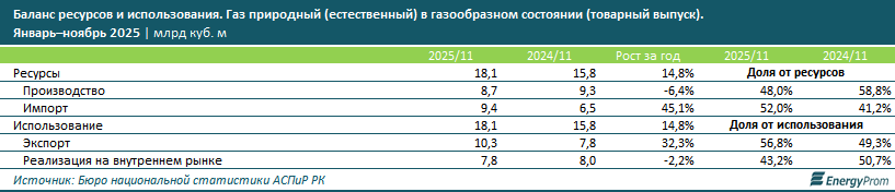 Так, за 11 месяцев прошлого года товарный выпуск природного газа в газообразном состоянии составил всего 8,7 млрд куб. м — на 6,4% меньше, чем за аналогичный период 2024-го. Собственным газом спрос (реализация на внутреннем рынке плюс экспорт) за январь–ноябрь 2025 года был покрыт на 48%, то есть значительно меньше, чем годом ранее (58,8%). Импорт газа, в свою очередь, вырос на 45,1%, до 9,4 млрд куб. м. Основным поставщиком стала Россия: 9,1 млрд куб. м. Остальные 371,5 млн куб. м пришлись на Туркменистан.