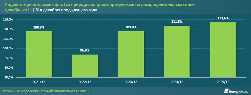 Ценовая динамика усиливает нагрузку на внутренний рынок. Природный газ, транспортируемый по распределительным сетям, по итогам декабря прошлого года подорожал на 13,6% к декабрю 2024-го.