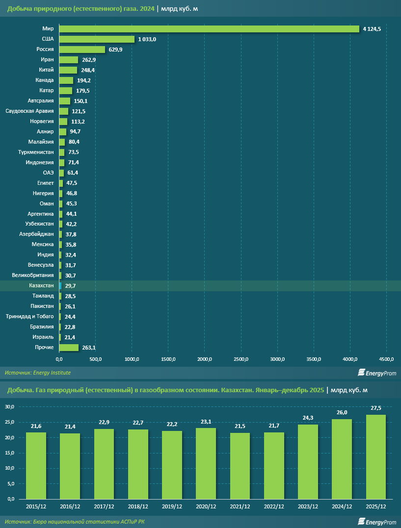 По данным Energy Institute, Казахстан по итогам 2024 года занял 25-е место в мире по добыче природного газа с объёмом в 29,7 млрд куб. м. Всего за 2024 год в мире было добыто 4,1 трлн куб. м природного газа. Лидерами рейтинга стали США (1 трлн куб. м), Россия (629,9 млрд куб. м), Иран (262,9 млрд куб. м) и Китай (248,4 млрд куб. м), на которых совокупно пришлось более половины глобального объёма добычи природного газа. Для сравнения: доля Казахстана составила 0,7%.