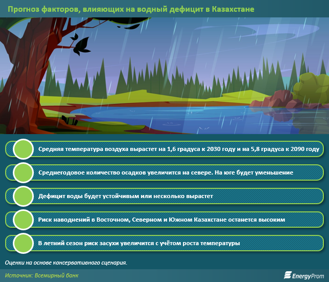 На основе моделей Межправительственной группы по изменению климата авторы доклада рассчитали возможные варианты будущего развития ситуации с водными ресурсами в Казахстане. По базовому сценарию ожидается, что дефицит воды в ближайшие десятилетия будет устойчивым или даже несколько увеличится. И это мнение ещё не учитывает планы Казахстана по расширению площадей орошаемых земель. На дефицит повлияет также общее изменение климата — рост средней температуры воздуха на 1,6 градуса к 2030-му и на 5,8 градуса к 2090 году. Среднегодовое количество осадков в северной части Казахстана увеличится, а в южной — уменьшится.
