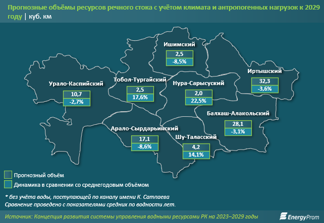 Казахстанские эксперты в сфере водных ресурсов также прогнозируют дальнейшее сокращение речного стока со стороны других государств. В Концепции развития систему управления водными ресурсами РК на 2023–2029 годы говорится, что в течение ближайших четырёх лет внутренний речной сток в Казахстане сократится со 102,3 до 99,4 куб. км, то есть на 2,9%. Это произойдёт за счёт уменьшения притока воды в реках со стороны сопредельных государств на 9,7%. Так, суммарный сток рек Арало-Сырдарьинского бассейна может сократиться на 8,6%, Иртышского – на 3,6%, Балхаш-Алакольского – на 3,1%, Ишимского – на 8,5%.