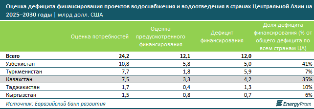 Эти данные близки к расчётам аналитиков другого международного института развития – Евразийского банка развития (ЕАБР). В докладе «Питьевое водоснабжение и водоотведение в Центральной Азии» специалисты ЕАБР пишут, что дефицит финансирования проектов в сфере водоснабжения и водоотведения в Казахстане на 2025–2030 годы составляет около 4,2 млрд долл. США. Согласно данным по уже заявленным проектам, за эти пять лет в РК намерены потратить на такие цели 3,3 млрд долл. США. По расчётам специалистов ЕАБР, чтобы достичь цели по обеспечению наличия и рационального использования водных ресурсов и санитарии (ЦУР ООН № 6), Казахстану необходимо потратить в ближайшие годы 7,5 млрд долл. США. В других странах Центральной Азии ситуация складывается аналогично: для реализации проектов запланированы суммы меньше необходимых. В целом общий дефицит в регионе превышает 12 млрд долл. США. Наибольшие доли в структуре этого дефицита приходятся на Казахстан и Узбекистан.
