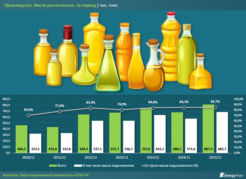 Согласно информации Бюро национальной статистики АСПиР РК, за январь–ноябрь 2025 года объём выпуска растительных масел в стране достиг 807,4 тыс. тонн, что существенно выше уровня аналогичного периода 2024-го, когда объём составлял 680,1 тыс. тонн. Прирост составил 18,7%, что подтверждает положительную динамику в отрасли. Выпуск конкретно подсолнечного масла достиг 683,7 тыс. тонн — на 19,2% больше по сравнению с январём–ноябрём 2024 года, когда его выпуск составлял 573,4 тыс. тонн. Таким образом, на долю подсолнечного масла приходится практически весь прирост, что отражает стратегическую переориентацию отрасли на производство именно этой продукции.