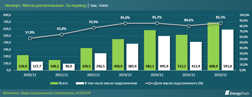 Экспорт растительных масел из Казахстана также демонстрирует устойчивый рост. В 2020 году объём поставок составлял 220,9 тыс. тонн, а к 2024-му он увеличился до 582,1 тыс. тонн, что соответствует росту в 2,6 раза. За январь–ноябрь прошлого года экспорт достиг 690,9 тыс. тонн — на 34,6% больше, чем за аналогичный период 2024-го (513,2 тыс. тонн). Это подтверждает высокий внешний спрос и растущую конкурентоспособность продукции казахстанского производства на международных рынках.
