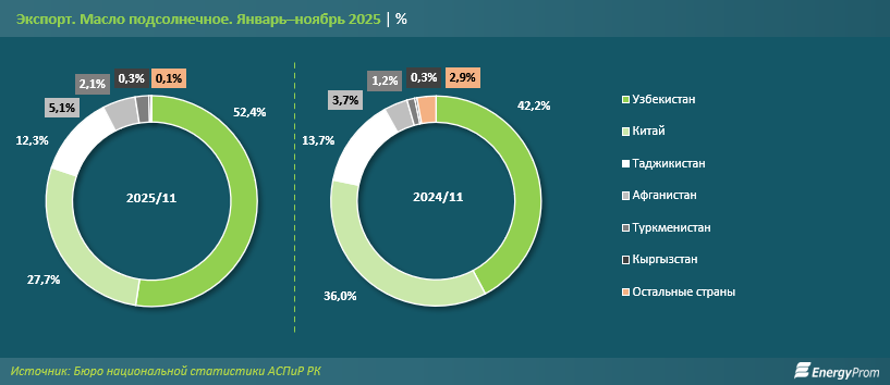 Лидирующую позицию среди стран, в которые отправляется казахстанское подсолнечное масло, уверенно сохраняет Узбекистан, увеличивший объём закупок с 177,2 тыс. тонн за январь–ноябрь 2024 года до 311,3 тыс. тонн за аналогичный период 2025-го. Рост составил 76%, а доля РУ в структуре экспорта казахстанского подсолнечного масла увеличилась с 42,2% до 52,4%.