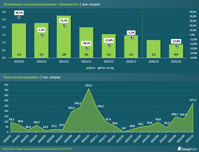 Объём производства шампанского в РК за январь–октябрь текущего года составил 829 тыс. литров — на 24,2% меньше, чем за аналогичный период 2024-го. Отметим: местное производство занимает на казахстанском рынке лидирующие позиции. Доля отечественных поставщиков в общем объёме ресурсов составила 94%, на долю импорта пришлось всего 6%. Экспорта в текущем году не наблюдалось.