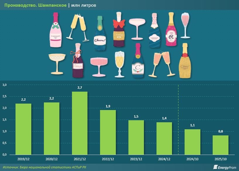Казахстанцы стали пить меньше шампанского. Объём реализации этого напитка на внутреннем рынке сокращается четвёртый год подряд. По информации из отчётов Бюро национальной статистики (БНС) АСПиР РК, за десять месяцев текущего года в торговых точках страны было реализовано всего 882 тыс. литров шампанского — сразу на 23,8% меньше, чем за аналогичный период 2024-го. Предыдущие три года динамика также была отрицательной.